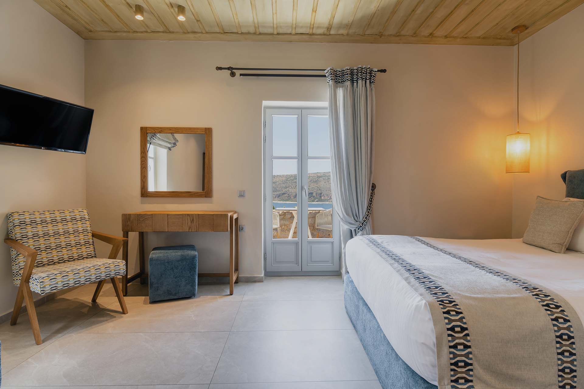 Αυτό το κλιματιζόμενο δωμάτιο 25 τ.μ. διαθέτει ιδιωτική είσοδο, μπαλκόνι με θέα, ένα διπλό κρεβάτι και έναν καναπέ. Περιλαμβάνει ψυγείο, σεσουάρ μαλλιών και προϊόντα περιποίησης Olivia by Papoutsanis, για μια άνετη και ευχάριστη διαμονή.